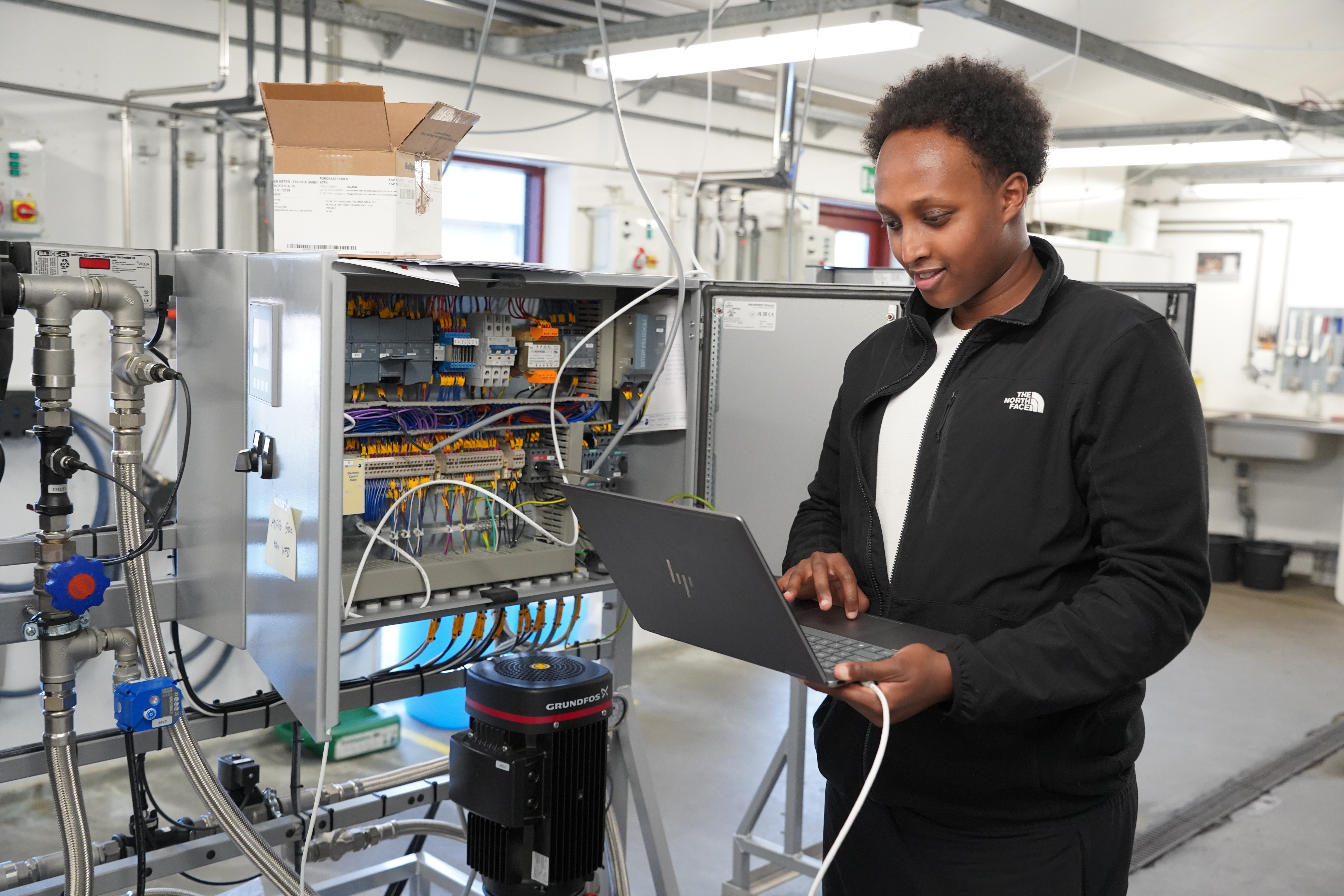 22-årige Mohamed Mumin, der går på 4. semester af automationsteknolog-studiet, arbejder målrettet på at udvikle et testprogram til pumpeanlæg, der gennem automatisering kan spare både tid og penge for virksomheden Condair, der er verdens førende producent i energieffektive løsninger til at regulere luftfugtighed og køle luft for et bedre indeklima og en mere effektiv produktion.